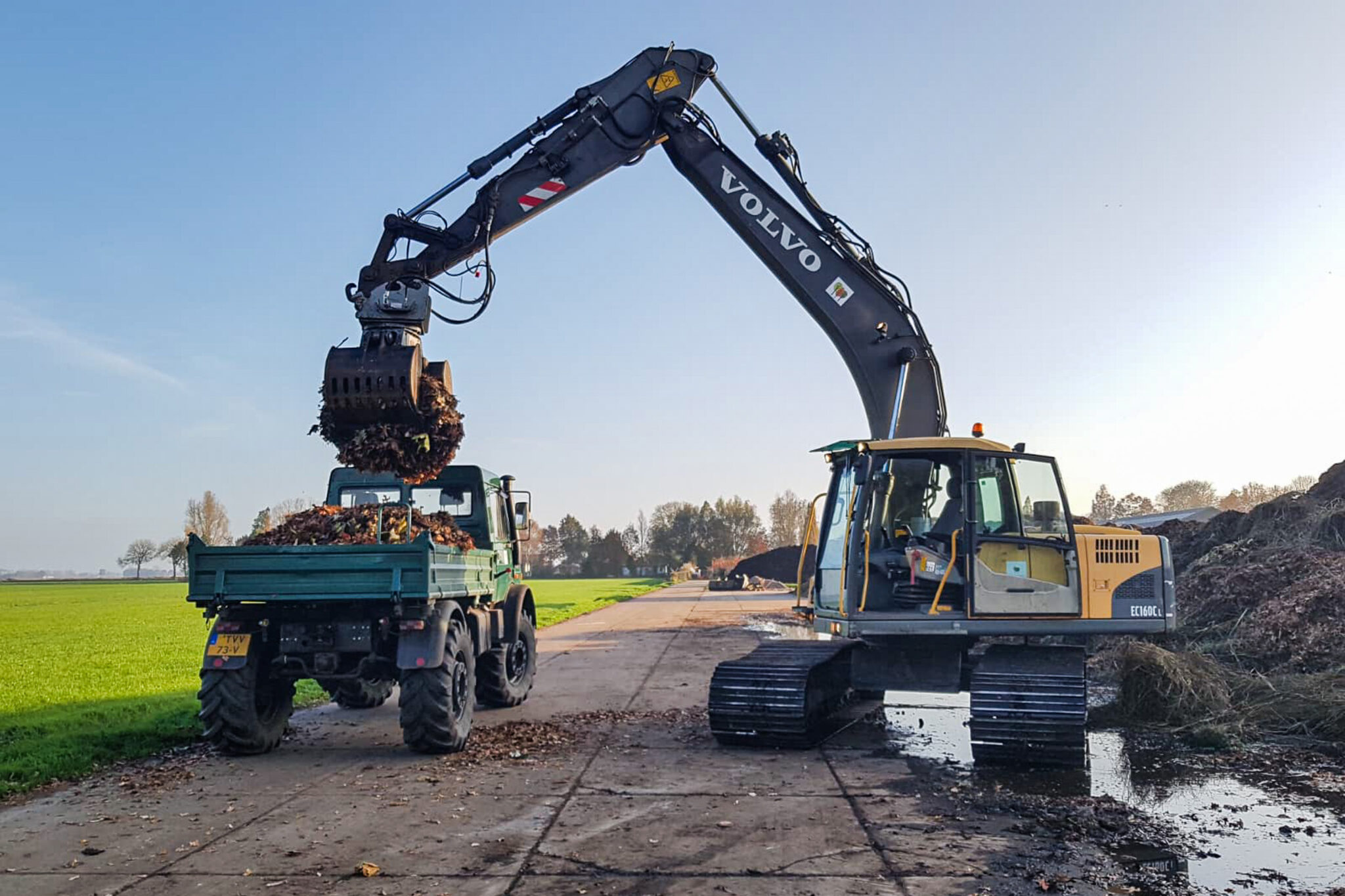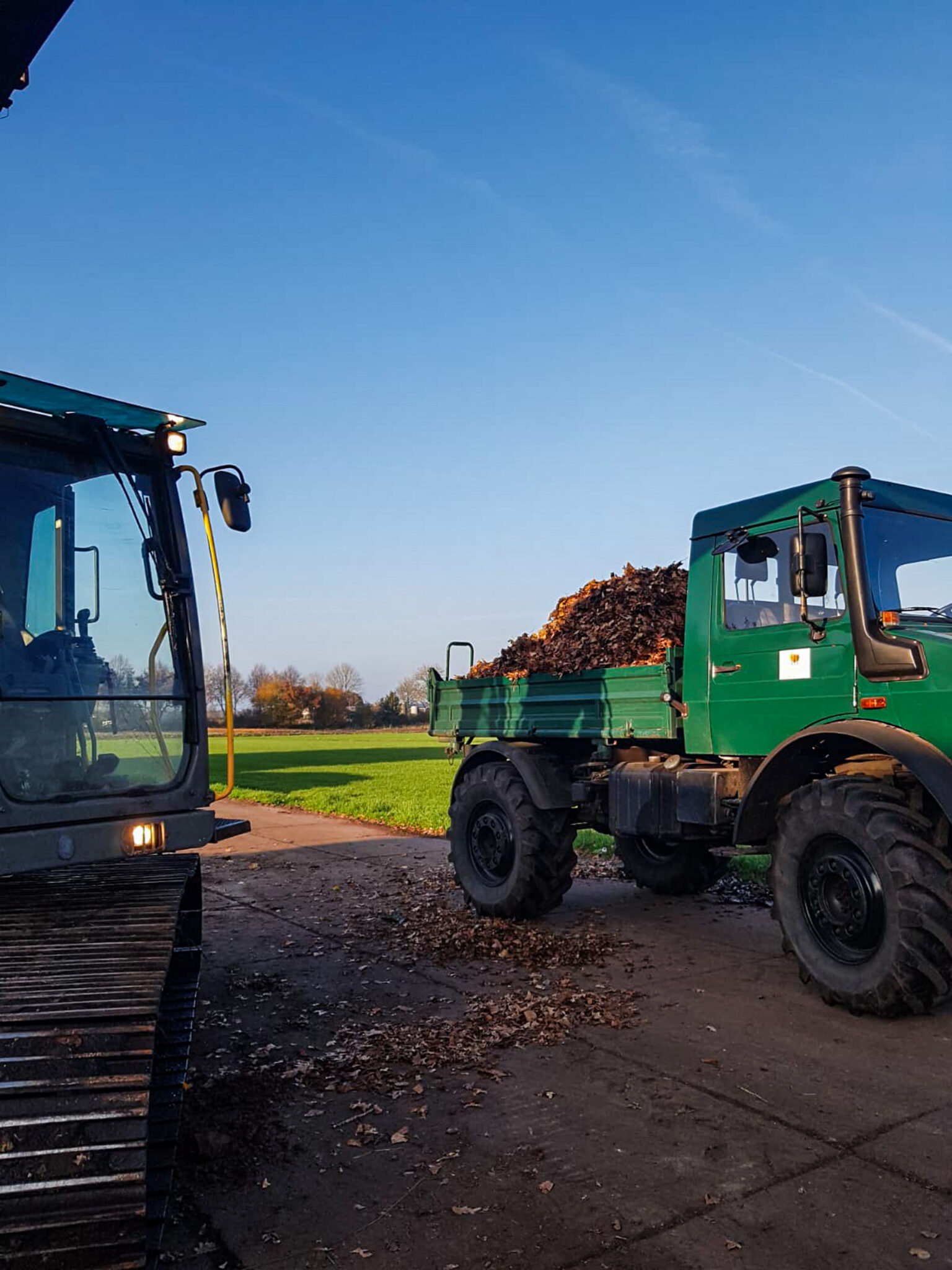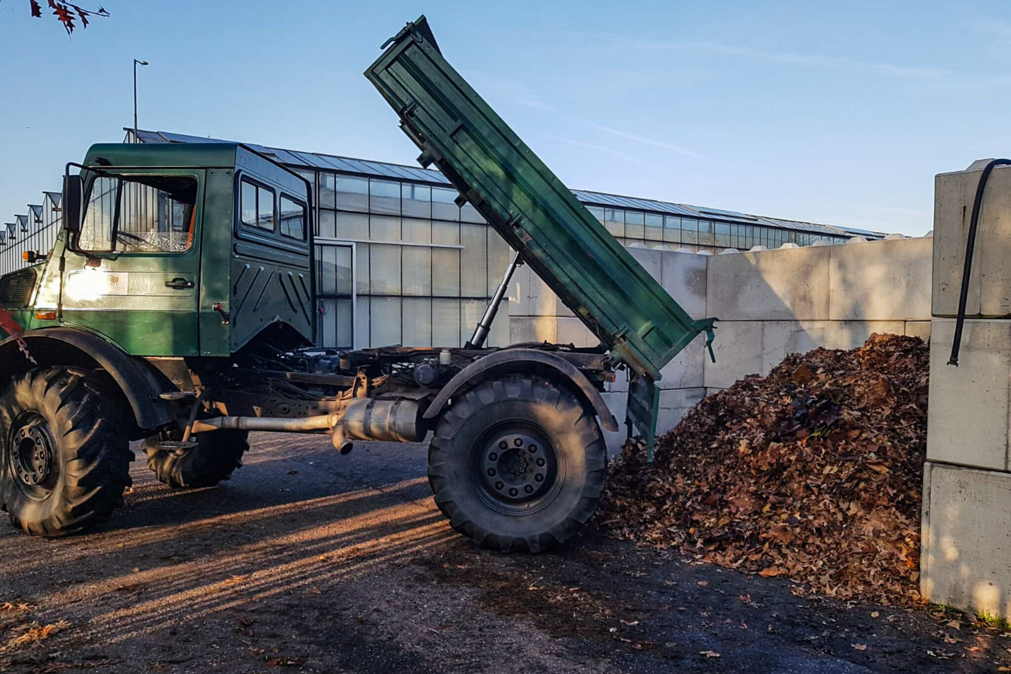 Bij de compostering van Hanekamp Duraroos hebben we een kleine selectie blad opgeladen en naar een opslagbunker getransporteerd. Dit blad zal komende winter worden gebruikt als een natuurlijk afdek materiaal tegen uitdroging en bevriezing van gerooide planten.